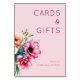 This wedding tabletop sign features a soft pink background adorned with a watercolor floral arrangement in shades of peach, coral, and light blue. The design includes elegant typography with "CARDS & GIFTS" prominently displayed at the top in bold serif font, while "thank you" is written in a lighter, italicized style below. The overall aesthetic is romantic and delicate, perfect for expressing gratitude at your special event. The balanced composition and harmonious color palette create a warm and inviting atmosphere, making it an ideal addition to any wedding celebration.
