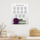 This elegant wedding seating chart has table assignments for 110 guests at 11 tables (10 people per table.) The design is beautiful, sophisticated, romantic and stylish. It features a single plum purple or eggplant colored rose reflecting in water with waves and ripples. The title reads "please find your table" in lacy script calligraphy. There is space for the names of the couple and wedding date.