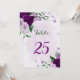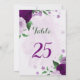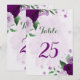 Beautiful romantic table number card featuring purple flowers and some green leaves .