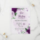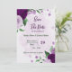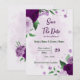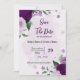 Beautiful romantic wedding save the date invitation featuring purple flowers and some green leaves .