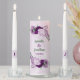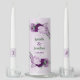 Beautiful romantic wedding unity candle set featuring purple flowers and some green leaves .