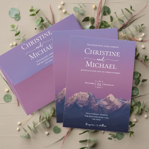 Romantic purple sunset snowy mountains wedding. Romantic wedding design with a landscape photograph of snow covered rocky mountains. The mountains are just barely touched by the soft orange glow of the setting sun. The sky above the majestic mountain range is coloured in such stunning natural hues of pink and purple. A light and aery gradient of colours slowly turning from purple to deep indigo and blue. All information on the product is fully customizable by clicking "Personalize this template". If you want to change the size of font or move some things around you can achieve that by clicking "Edit using design tool".