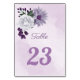 Beautiful botanical table number card featuring romantic purple lavender and white flowers with green leaves