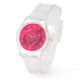 I only have one complaint. I ordered the watch with clear case and strap, and what was sent was white case and strap. I'm going to keep it because 1) it looks very nice in white, and 2) it would take too long to get a replacement made and sent in time for my occasion. Aside from the mix up with the color, the watch does look very good in white. The purple dial is actually sparkly which did not show in the online images. That was a nice surprise. If you like Swatch watches this is very similar to those. It's 33.6mm in diameter, 10.5mm thick, and 40.6mm lug to lug. Stainless steel case back says 3ATM/30m WR, so no swimming or showering or submerging this one. If you like Woodstock, this is a great choice.