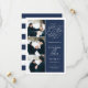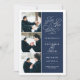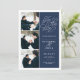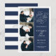 Simple and elegant, our Romantic Request photo save the date card features three of your favorite engagement photos aligned along the left side, with your wedding details on the right in white on navy blue. "Save the date" appears in white script typography with a chic heart worked into the design. Add your wedding details, including names, wedding date, and location. Cards reverse to modern horizontal stripes in navy and white, with an additional text field for your wedding website or additional information..