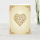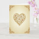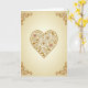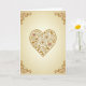 This greeting card features a large heart centered on the front, outlined in a warm gold-brown tone that looks like aged metal or stitched thread. Inside the heart, detailed roses, curling vines, and leafy shapes fill the space, all drawn in the same rich color. Most of the roses match the gold tones, while two flowers show soft pink centers that add a gentle romantic accent. The background is a creamy beige that softly fades near the edges, keeping attention on the heart. Curled scroll designs in each corner echo the floral details and frame the artwork. With no text on the front, this card leaves room for a personal handwritten message, making it a thoughtful choice for sharing Valentine’s Day feelings with someone special.💌.