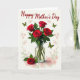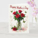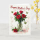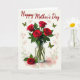 This card features a bouquet of five deep red roses arranged in a clear glass vase, with layered petals that look velvety and full of quiet affection ❤️. Green stems and leaves show through the transparent water, adding a natural contrast that feels grounded and intimate, like a thoughtful gift set on a kitchen table. Around the edges, pale pink flower shapes and slender sprigs lightly frame the scene, giving the layout a soft, romantic border without crowding the center. A single red rose sits near the bottom left corner, angled as if it was just placed there by someone who cares. Three lime-green butterflies hover nearby, their small patterned wings suggesting gentle movement and a light, friendly warmth 🌼. Near the top, the phrase “Happy Mother’s Day” appears in flowing red lettering, centered above the bouquet. The background stays a creamy off-white so the reds and greens stand out clearly. The bottom-left rose is detailed with a curved stem and shaded petals against the pale backdrop.