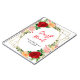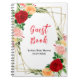 This beautiful and elegant baby shower guest book features watercolor red, pink and orange roses with foliage on a gold geometric frame. The text combines handwritten script and serif fonts for a stylish and modern look. This is perfect for a summer rustic baby shower.
