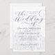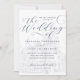 Impress your guests with this elegant wedding invitation by JessicaAmber. This classic card features a romantic calligraphy title for 'the wedding of'. Elegant dark blue lettering displays the bride and groom names, and details of the wedding, including the location, date and time. The background has a faint vintage illustration of a castle, which you can replace with an image of the destination where you will be married (transparent or white background preferred). This invitation is preferred for when the couple are hosting the event themselves.