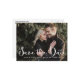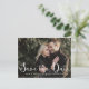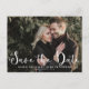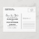 Whimsical and stylish save the date postcard featuring white modern calligraphy script. Similar items and other colors are available.