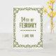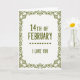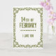 This greeting card centers a simple message on an off-white background, with everything printed in muted olive green. The text runs down the middle in stacked lines: “14TH OF FEBRUARY,” then five tiny solid hearts, and then “I LOVE YOU.” The letters look like a rustic sans‑serif style, neat and friendly, like a careful note rather than something formal. Around the message is a thin olive-green frame made of curling vines, leaf shapes, and scroll-like lines, with small heart details tucked into the corners. The border lines are slightly uneven, which makes it feel human and caring instead of overly perfect. The earthy green on soft white gives the card a calm, steady kind of romance that fits both love and close friendship 🥰. It feels meaningful because it keeps the focus on the date and the words you most want someone to remember ❤️, making it easy to share Valentine’s Day sentiments.