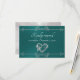 Design features an elegant teal background embellished with a delicate silver scroll heart and dividers. Stylish script place holders for the date are on the front, and response information on a white pearl back. Perfect for the simple to most elegant wedding. Also available with different colored backgrounds for your wedding theme colors. Designed to coordinate with the "Romantic Scroll Hearts & Calligraphy" Wedding Collection. To change details, click «Personalize». To move the text or change the text size, font, or color click «Click to customize further»