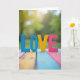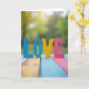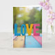This design shows the word “LOVE” set up as chunky 3D letters resting on painted wooden planks. The L and O are blue, the V is yellow, and the E is pink, and the letters look slightly worn like they’ve been held and used before. Behind them, the background fades into soft green leaves with warm spots of sunlight, like a quiet afternoon in a garden. The wood surface under the letters has stripes of blue, yellow, and pink, which helps the colors feel tied together. The word “LOVE” sits right in the center, and the letters look like simple, upright print shapes with no extra flourishes. It feels meaningful because it keeps the message easy to read and easy to feel, whether it’s for a partner or a close friend ❤️. It’s the kind of card that says a lot without trying too hard, and it’s perfect for sharing Valentine’s Day sentiments 🥰.