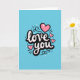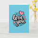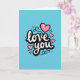 This greeting card features the words “love you” right in the center in thick black letters, edged with a white outline and a soft pink glow. The background is a bright turquoise-blue that makes the message stand out right away. Around the text, lots of pink hearts spread outward, with lighter highlights that make them look a bit rounded. Curving black swirls loop around the hearts, and small white and black dots are sprinkled across the card like confetti. The overall look feels upbeat and affectionate, like a simple, honest way to say what you feel. The lettering looks like casual hand-drawn writing, and the glow helps it feel extra warm ❤️. It’s a meaningful card to give because it keeps the focus on love and care without needing anything complicated 🥰.