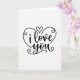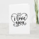 This greeting card shows the words “i love you” in smooth, flowing cursive letters drawn in black at the center of a white background. A large black heart outline wraps around the message, making the words feel held and protected. The dot over the “i” is replaced by a tiny filled-in black heart, which adds a sweet detail without adding clutter. Above the big heart, there’s a smaller heart outline, like a little echo of the main shape. The lines are slightly thicker in some places and thinner in others, so it feels like real pen strokes rather than a typed font. Small curls and swirls decorate parts of the heart outline, giving the design a gentle romantic touch. It’s simple and direct, which makes it meaningful to give when you want to say something important without a lot of extra words 🥰❤️.