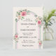 This design features a beautiful watercolor illustration of a delicate floral arch, centered over a soft, neutral background. The arch is adorned with blooming pink and ivory roses and lush green foliage, framed by pale mint green and soft pink accent stripes. The elegant layout is perfect for a spring, summer, or garden wedding with a romantic style. Easily customize all text and details for a truly personal touch!.