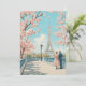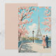 A beautifully illustrated 1950s-style travel poster depicting a romantic couple strolling beneath blooming cherry blossoms with the Eiffel Tower in the background. The pastel tones and retro aesthetic capture the timeless charm of springtime in Paris.
