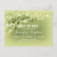 vintage and rustic save the date postcards with garden lights - string lights hanging on the tree branches. Light green romantic and whimsical lights save the date postcard - part of the outdoor wedding set.