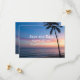 A breathtaking beach sunset scene featuring a golden and purple sky, calm ocean waves, and a black silhouette of a palm tree on the right. The warm hues reflect on the water, creating a romantic and serene atmosphere—perfect for a wedding invitation.