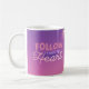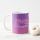 A charming mug featuring an enchanting illustration of two hands reaching toward each other, connected by a delicate red line adorned with tiny hearts. Set against a dreamy pink sunset sky, this design captures the romance and whimsy of love. The inspiring phrase "Follow your heart" adds a meaningful touch, making this mug a perfect gift for lovers, couples, or anyone who cherishes the beauty of connection.