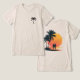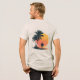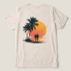 A silhouette of a couple holding hands as they walk along a beach during a vibrant sunset. Palm trees sway gently in the background, while birds fly across the colorful sky. The peaceful scene captures the beauty of love and nature in perfect harmony.