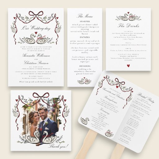 Add a touch of romance to your wedding reception with this stunning calligraphy menu card. The design showcases an elegant script "The Menu" title and a sweet illustration of two swans with their necks intertwined, creating a heart shape. The crisp white background ensures the design's sophistication and readability, making it a perfect choice for any wedding theme. This menu card serves as a beautiful prelude to the culinary journey your guests are about to embark on, reflecting your love story.