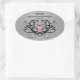 Oval labels with space for 2 names and a wedding date on it and a black swirly heart with a smaller heart inside in pink on a gray background on them.