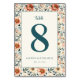 This wedding table card features a romantic floral border in shades of peach, cream, and muted green, creating an elegant and whimsical frame. The central design includes a bold teal numeral "8" with the word "table" above it in delicate script, set against a clean background for a sophisticated look. Customizable text fields allow for personalization with names and date, making it perfect for adding a personalized touch to your special day. The combination of classic typography and playful florals evokes warmth and celebration, ideal for enhancing the ambiance of your wedding reception.