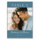 This wedding table card features a modern, minimalist design with a split teal background framing a central photograph of two individuals in an intimate pose. The layout is clean and balanced, using a combination of sans-serif and elegant script fonts to highlight the table number at the top and names below the image. The color palette consists of soothing teal tones complemented by soft hues from the photo, creating a warm and romantic atmosphere perfect for a beach-themed wedding. The overall style blends simplicity with sentimentality, making it ideal for couples looking to add a personal touch to their special day.