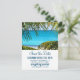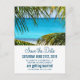 Wedding save the date postcard with a beautiful photograph of a turquoise tropical beach with large green palm fronds framing the scene.