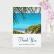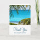 A folded wedding thank you card with a beautiful photograph of a turquoise tropical beach with large green palm fronds framing the scene. Personalized message inside card.