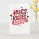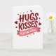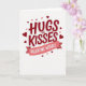 This greeting card features a white background with the big words “Hugs and Kisses” front and center in deep red. The letters look slightly raised with a soft shadow and a thin white edge, so they stand out clearly. A smaller “and” sits between the larger words, linking them in a simple, gentle way. Below the main message, there’s a curved pink banner that reads “VALENTINE WISHES” in white letters. Red and pink hearts of different sizes are scattered all around the text, with some near the corners and others floating upward. The mix of hearts and warm colors makes the card feel affectionate and fun without trying too hard 🥰. It’s a meaningful choice when you want to say you care, whether it’s for a partner or a close friend ❤️. Hope it helps you share your Valentine’s Day feelings with someone special.
