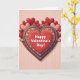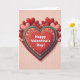 This Valentine's Day card centers on a large, layered heart that feels like a handmade patch. The outer heart is deep forest green with small white dashed lines that look like stitching around the edge. Inside that is a red ring sprinkled with tiny white hearts, leading to a shiny red center. The message “Happy Valentine’s Day!” sits in the middle in white, easy-to-read block letters. Around the main heart, several smaller hearts in scarlet red and soft blush pink float like a loose circle, each with a slight shadow. The background is pale pink with faint vertical lines, keeping the focus on the heart while adding a gentle fabric feel. It’s a sweet, warm design for romance or friendship, and it pairs perfectly with a note and a little treat ❤️