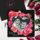 Personalize this square, red rose Valentine's Day photo card with your photo and message. Black and red card with heart shaped rose photo frame has a black speckled background on the front and back, with your initials on the back. Photo can be cropped and positioned to fit in the heart shape. Layers may need to be turned off temporarily to move around your photo.