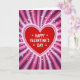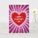 This card bursts with Valentine’s Day spirit, featuring a bold red heart at the center that instantly draws attention. Inside the heart, the message “HAPPY VALENTINE’S DAY” appears in crisp white lettering, surrounded by smaller hearts that add depth and warmth. Soft pink and white rings frame the heart, giving it a layered, raised look. The background is filled with flowing stripes in shades of red, pink, and purple, creating movement and energy throughout the design. Tiny white hearts and sparkling dots are scattered across the scene, adding a festive, dreamy touch. With its bright colors, balanced layout, and joyful details, this card captures romance, celebration, and heartfelt emotion, making it perfect for sharing love with someone special on Valentine’s Day. ❤️💌