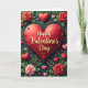 This card shows a rich and romantic Valentine’s Day scene centered around a large red heart. In the middle of the heart, elegant gold lettering reads “Happy Valentine’s Day.” Small red hearts surround it, giving the design a sweet, decorative look. The deep teal background adds contrast and makes the red and gold colors stand out.