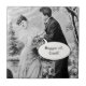 Stylish, two-tone image of lovers on a pier stepping into a gondola. A man with mustache is holding a woman's hands and confessing his love to her by the moonlight. Both are dressed in 1890s fashions. Cleaned up to decorate any item in a stylish and modern way. Add your own text to this painting of the two realistic people on a Valentine's Day if you please or just enjoy the detailed Victorian art.