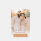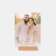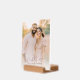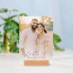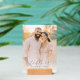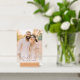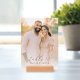 This wedding table card features a warm, romantic photograph of a couple standing close together in an outdoor setting with soft, golden lighting. The design uses a harmonious color palette of beige, pink, and gold tones to create an inviting atmosphere. Elegant cursive script is used for the fixed text "table 12," while a simple serif font provides clear identification for customizable names. The overall mood is intimate and celebratory, making it perfect for weddings or formal gatherings.