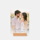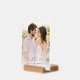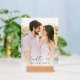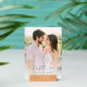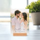 This wedding table card features a romantic, intimate scene with two individuals standing close together against a softly blurred outdoor backdrop during sunset or sunrise. The warm color palette of beige, peach, and light pink clothing contrasts beautifully with the natural greens and browns of the background, creating a serene and nostalgic atmosphere. Elegant cursive typography highlights "table 12" while simple serif fonts display names, adding a touch of sophistication to the minimalist design. Perfect for setting a heartfelt and inviting tone at your special event, this card captures the essence of love and connection in a realistic yet dreamy style.
