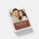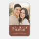 This wedding match design features a warm, romantic layout with a split composition. The top half showcases a photograph of two individuals smiling closely together against a soft-focus outdoor background bathed in golden hues, suggesting an intimate moment at sunrise or sunset. Below the image is a solid brown block that contrasts beautifully with the lighter tones above, providing a clean space for elegant script typography reading "The PERFECT MATCH." The overall style combines realism and modern minimalism, creating a joyful and affectionate mood perfect for celebrating love and companionship on your special day.