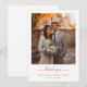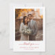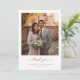 This wedding thank you card features a beautifully composed photograph of a couple standing together, with warm sunlight creating a soft glow around them. The design uses a classic color palette of golden yellows and muted grays, complemented by the greenery in the bouquet. Elegant typography highlights the phrase "thank you" in cursive script, followed by clean sans-serif fonts for names and location, all set against a minimalistic background to emphasize the romantic mood. Perfect for expressing gratitude after a celebration, this card combines timeless aesthetics with an intimate feel.