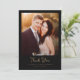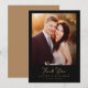 This wedding thank you card features a warm, romantic design with a central photograph of two individuals standing closely together, framed by a black border. The color palette includes golden sunlight and soft earthy tones, creating an intimate atmosphere. Elegant cursive script is used for the "Thank You" message, while a simple serif font provides location details, offering a sophisticated yet heartfelt aesthetic. Perfect for expressing gratitude after a special occasion, this card combines photographic realism with stylish typography to celebrate love and appreciation.