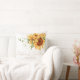 This romantic wedding keepsake pillow features a floral design. The background is a simple and elegant white with golden watercolor sunflowers. A delicate wild bouquet is pictured at the top, with the names of the couple printed below.