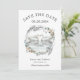 A romantic wedding Save the Date card perfect for spring, summer or fall weddings featuring a pair of white swans facing each other. A lovely watercolor sketched and floral wreath surrounds the swans with off-white roses and trailing greenery in a blue-green shade. Personalize with your details by editing the easy-to-use text template.