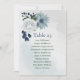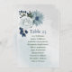 Beautiful botanical seating chart card featuring romantic white, dusty blue and navy blue flowers with green leaves.