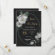 Unique wedding invitation featuring romantic white flowers and green leaves botanical geometric frame black background.