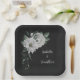 Unique wedding paper plate featuring romantic white flowers and green leaves on black background.