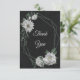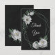 Unique wedding thank you card featuring romantic white flowers and green leaves on black background.