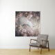 A gorgeous tapestry of a white peacock with pink accents on the feathers. The harmonious blend of pastel colors, from the peacock's white feathers with pink accents, to the blush pink of the flowers, evokes a feeling of serenity, tranquility and old fashioned romanticism.
