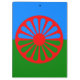 Official Romany gypsy traveller flag of green and blue representing the earth and sky with a red wagon wheel, representing travel.